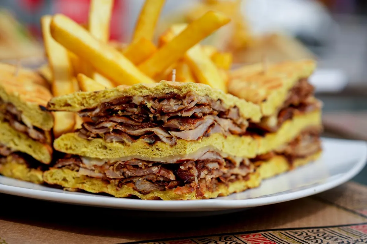 3 Τετράγωνες πίτες με ψιλοκομμένο & φρεσκοκομμένο γύρο χοιρινό, κασέρι & μουσταρδομαγιονέζα. Συνοδεύεται από πατάτες τηγανητές
