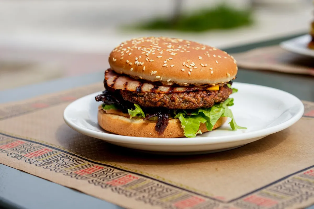 Με μπιφτέκι μοσχαρίσιο, cheddar, μαρούλι, πίκλες, μπέικον, καραμελωμένα κρεμμύδια & BBQ sauce