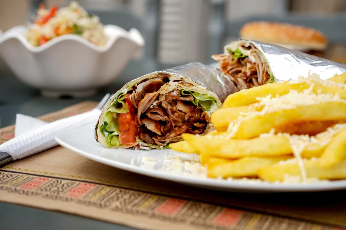Tortilla με γύρο χοιρινό κομμένη στη μέση, μαρούλι, ντομάτα, πατάτες τηγανητές, σως γιαουρτιού & κεφαλοτύρι
