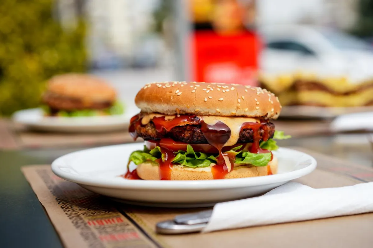 Με μπιφτέκι μοσχαρίσιο, ντομάτα, μαρούλι, μπέικον, cheddar, Texas sauce & μαγιονέζα